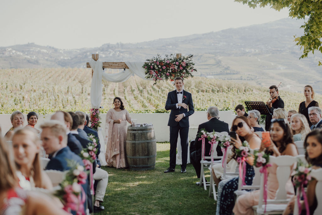 Set in the vineyards of Quinta da Pacheca, in the heart of the Douro Valley, the day unfolded with a quiet sense of ease. The ceremony, overlooking the vines, carried a simplicity that allowed every emotion to be felt without distraction. Nothing felt excessive, the place, the light and the atmosphere were in perfect harmony.